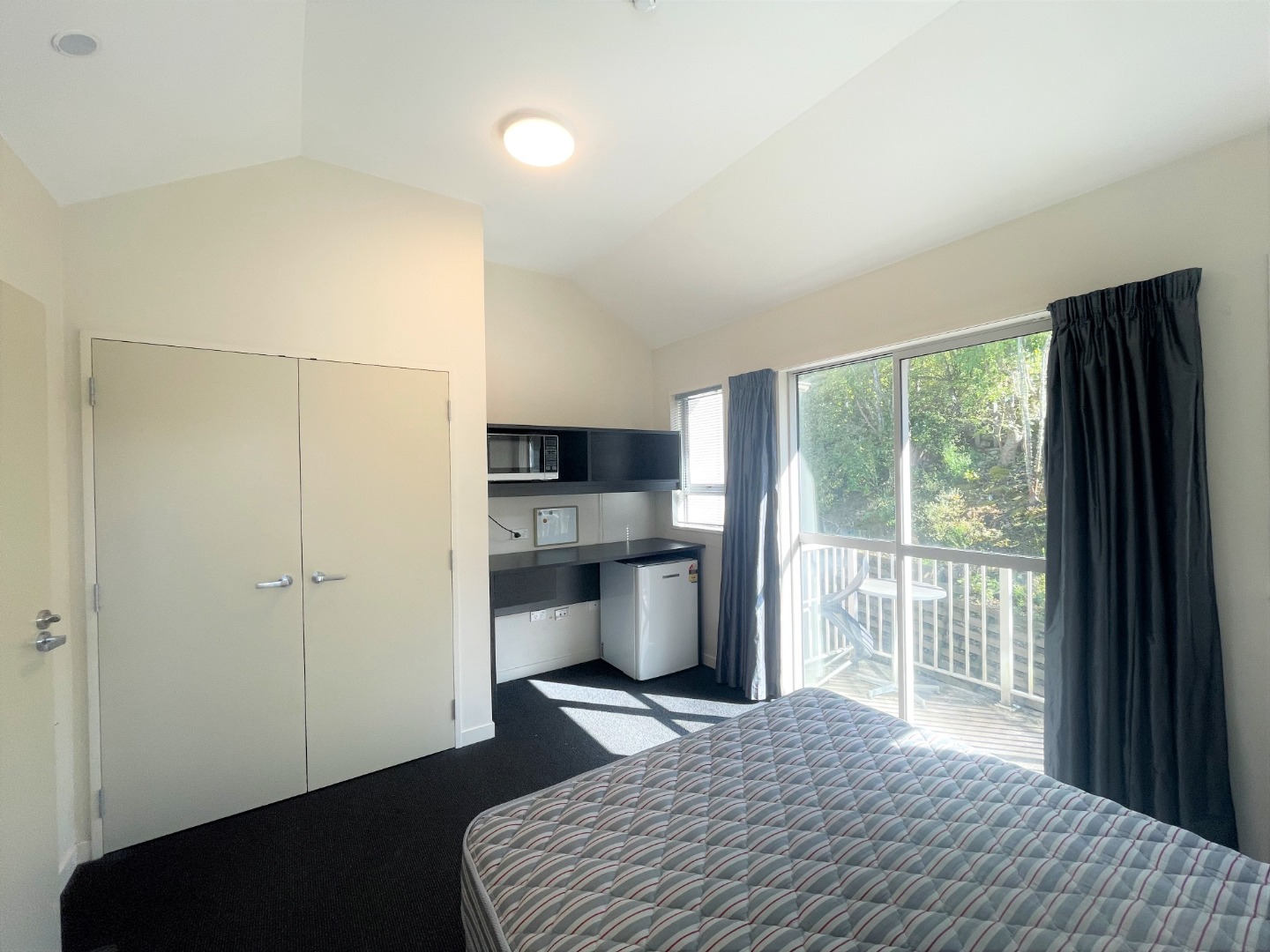 - A mini fridge, study desk and queen sized bed